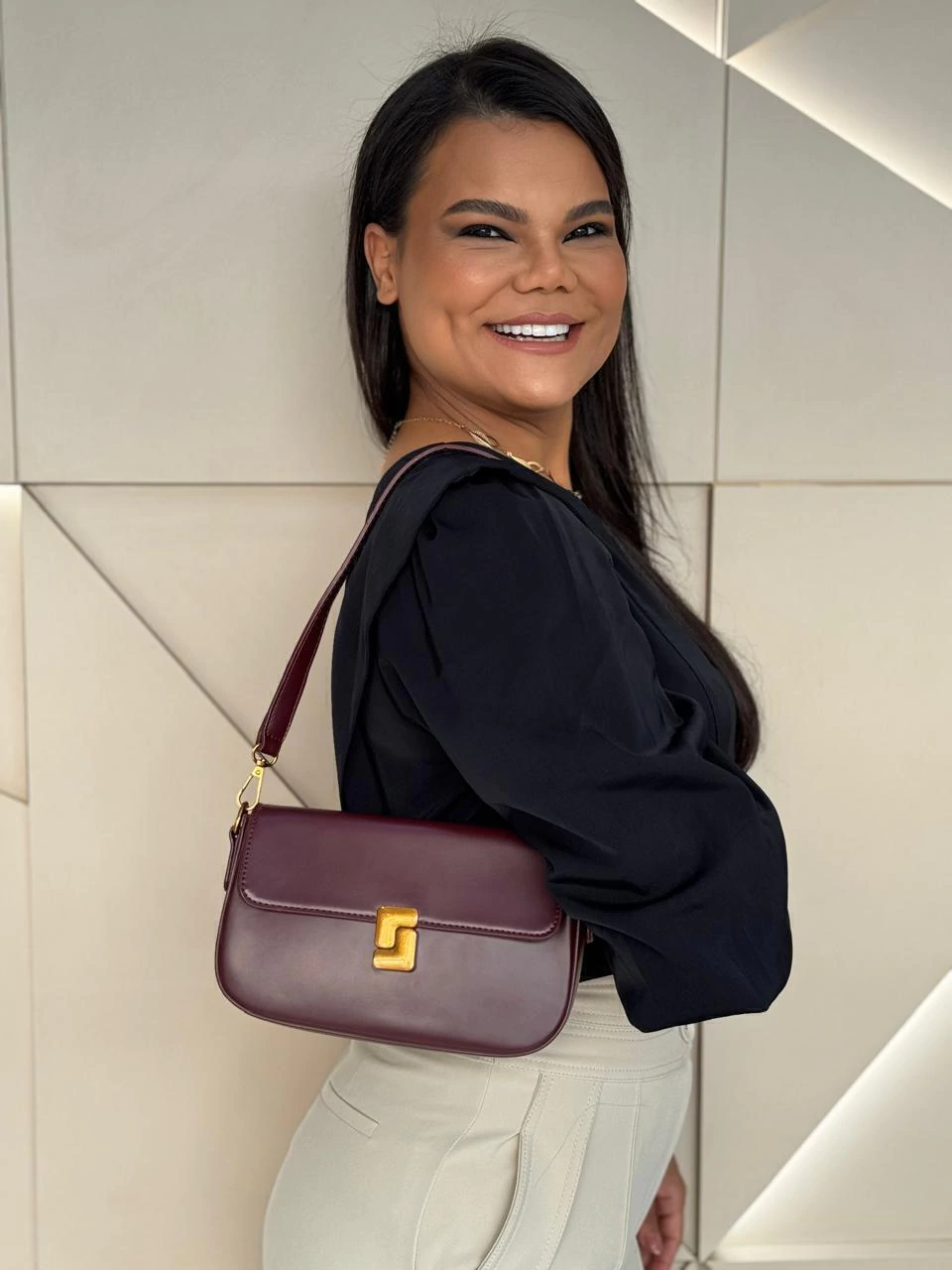 • Formato baguete estruturado, que mantém a forma da bolsa.
