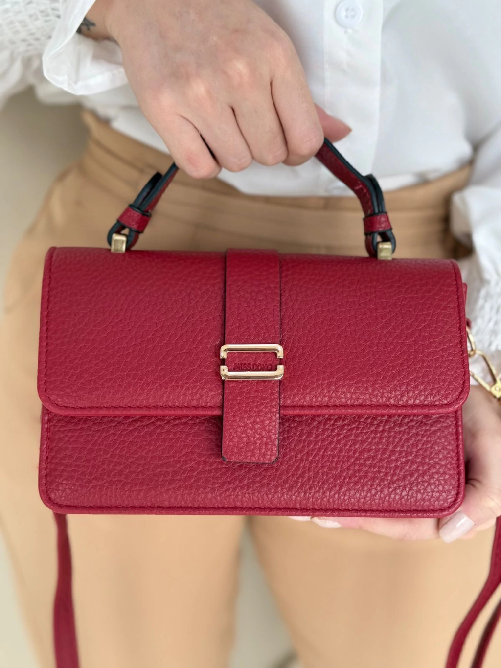 • Fechamento superior com tampa e detalhe em fivela decorativa.