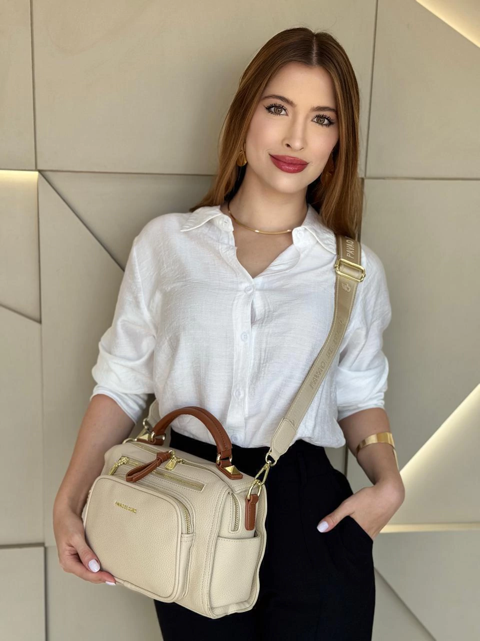 Produzida em couro PU de alta qualidade, é resistente, mantém o formato e conta com ótimo espaço interno.